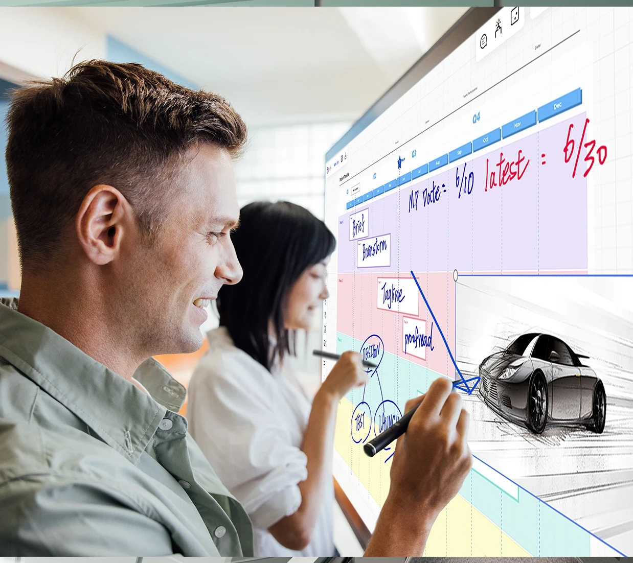 40-point touch allows multiple users to simultaneously write or draw on the display’s surface using styluses or their fingers, or both at the same time. Palm recognition technology minimizes errant touch inputs from palms, wrists, sleeves, etc., so that users can write and annotate freely.