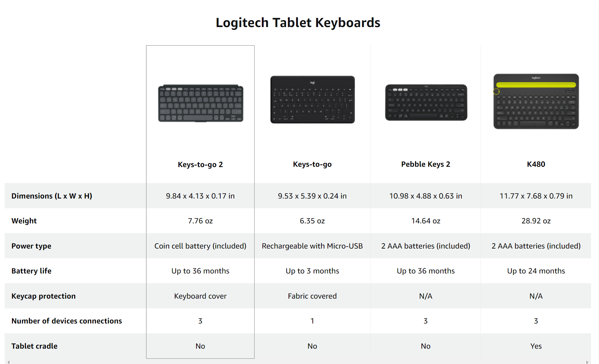 Made with recycled plasticThe plastic parts in Keys-To-Go 2 include certified post-consumer recycled plastic—36% for Graphite and Pale Grey, and 33% for Lilac—to give a second life to end-of-life plastic from old consumer electronics and help reduce our carbon footprint.* *Excludes packaging and printed circuit board (PCB). |