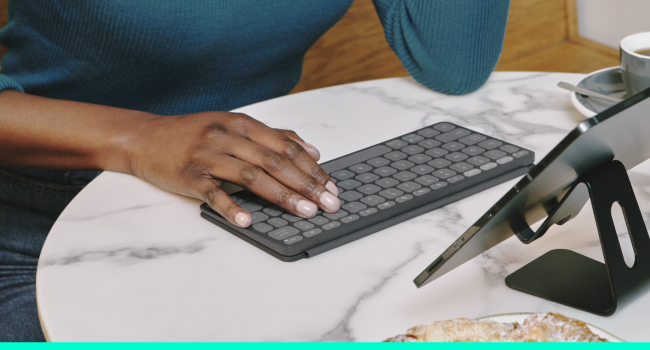 With a low profile and perfectly spaced scissor keys, enjoy a roomy and comfortable fluid typing experience similar to a laptop, wherever you go.