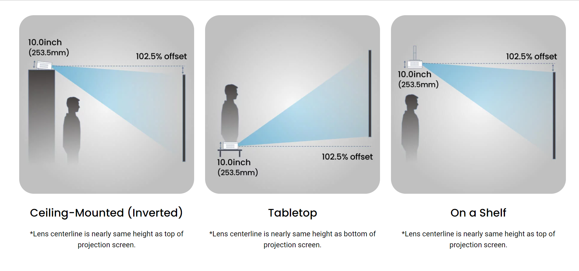 You can place the projector on a table, on a shelf, or mount it on the ceiling as shown below.