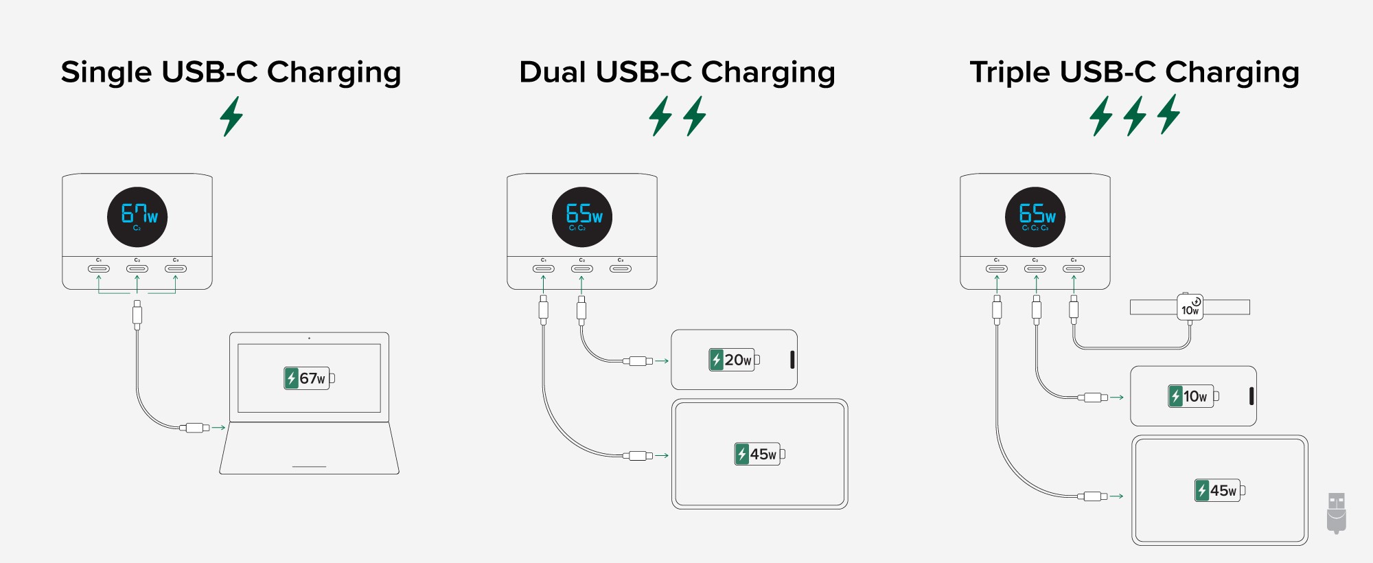 From the smallest earbuds to the largest laptops — 3x USB-C ports and 3x power outlets