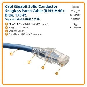 For peace of mind, this 175-foot Tripp Lite Cat6 Gigabit Solid Conductor Snagless Patch Cable comes backed by a lifetime warranty. The N202-175-BL is manufactured in compliance with strict RoHS specifications, reflecting Tripp Lite’s commitment to environmental responsibility.