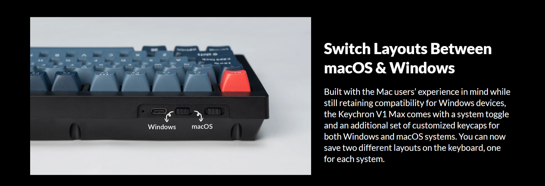 The V1 Max is a fully customizable mechanical keyboard, offering both 2.4 GHz wireless and Bluetooth 5.1 connectivity. Its compact 75% layout, gasket mount design, sound absorbing foam, double-shot PBT keycaps, and more take your typing experience to a new level, delivering heightened levels of comfort and productivity.