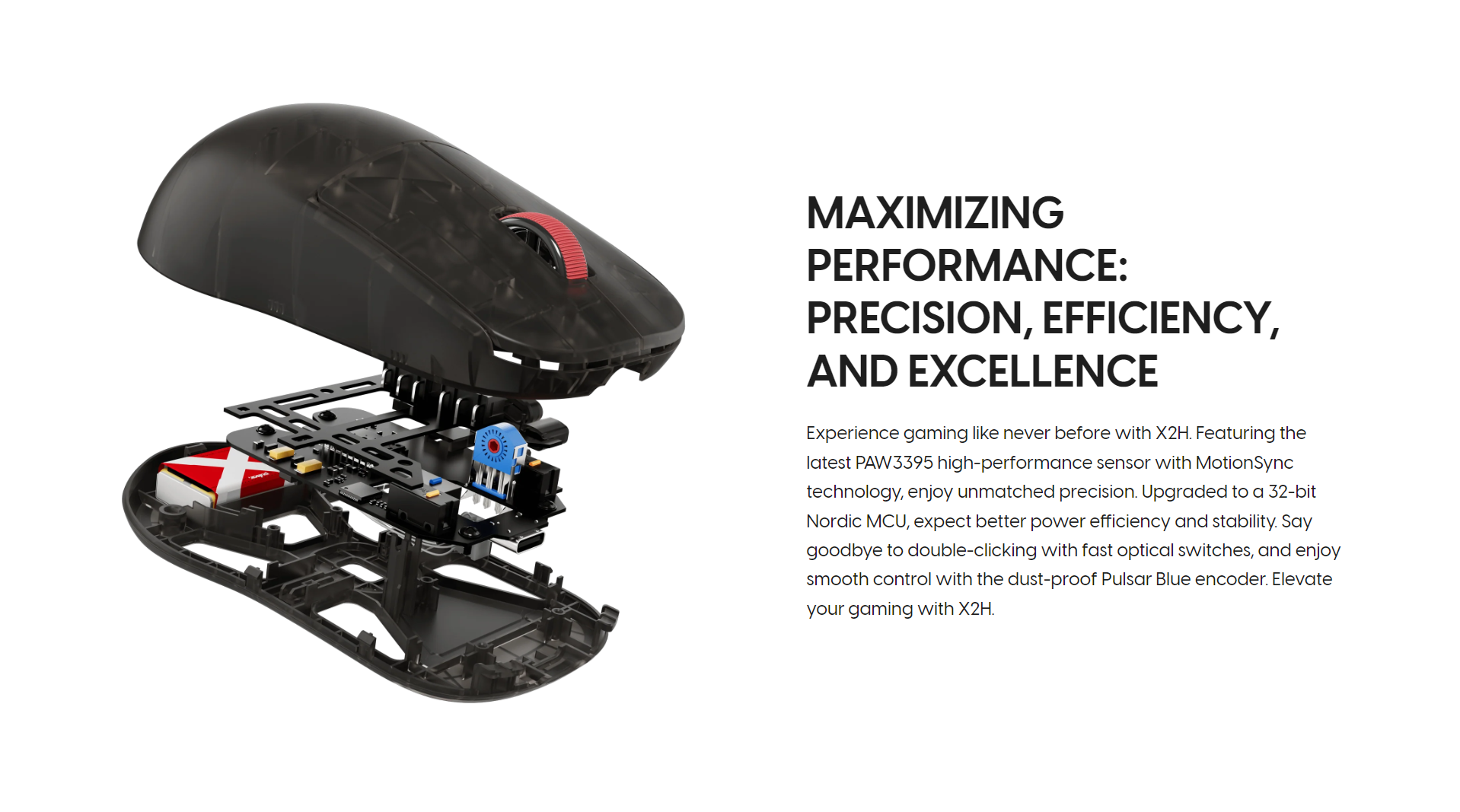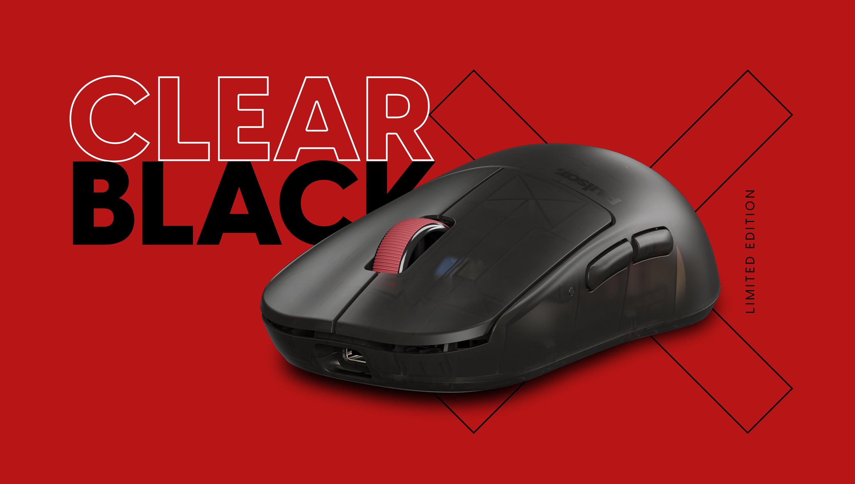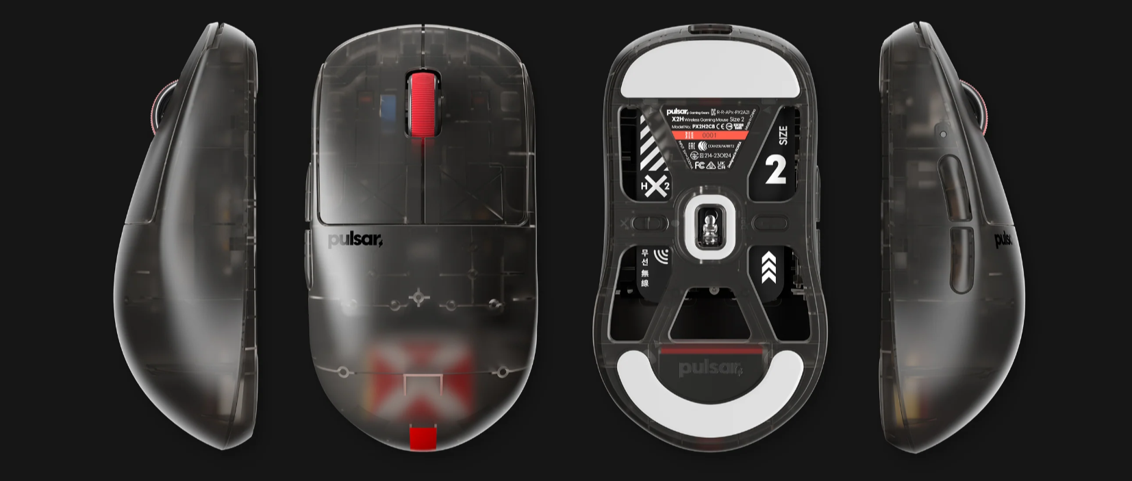 The latest X2H Clear Black Edition gaming mouse from Pulsar features a translucent black design with striking red accents, capturing Pulsar's signature style that stands out. The X logo, visible through the clear black shell, evokes the intense spirit of eSports. With a secure and comfortable grip and a lightweight design, this mouse is not just about looks. It embodies Pulsar's technology, engineered to drive your gaming success.