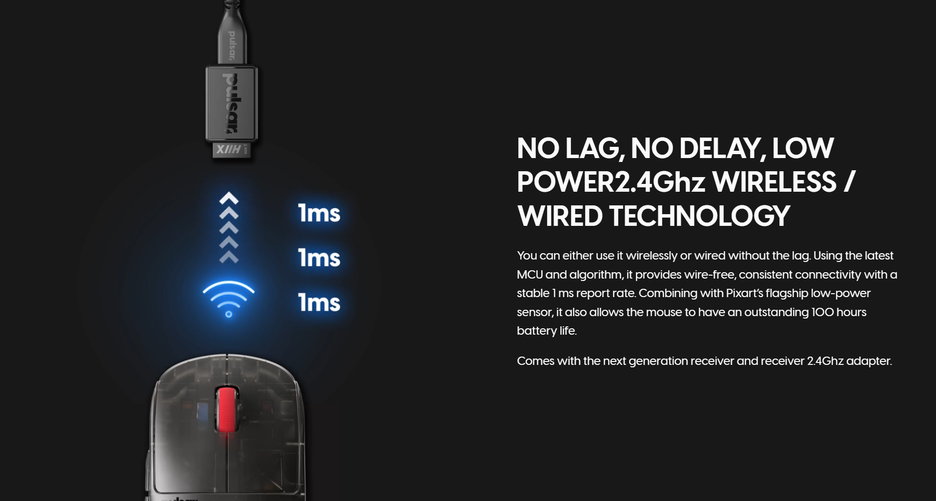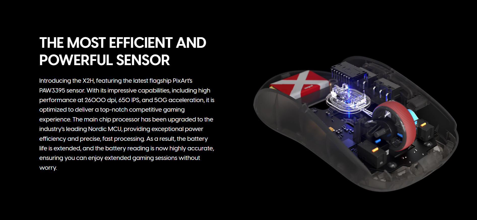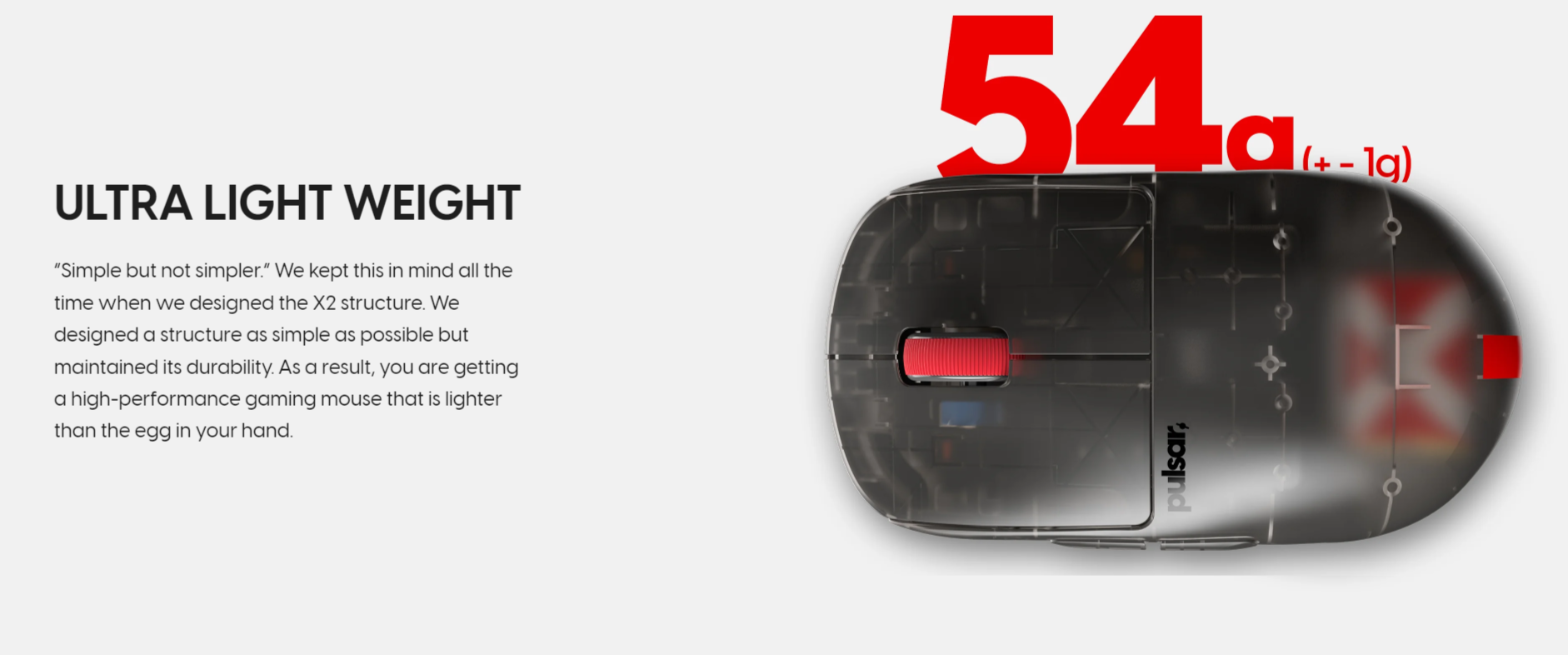 The latest X2H Clear Black Edition gaming mouse from Pulsar features a translucent black design with striking red accents, capturing Pulsar's signature style that stands out. The X logo, visible through the clear black shell, evokes the intense spirit of eSports. With a secure and comfortable grip and a lightweight design, this mouse is not just about looks. It embodies Pulsar's technology, engineered to drive your gaming success.