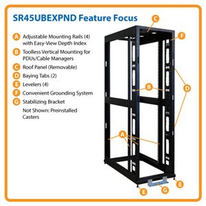 The SR45UBEXPND contains no doors or side panels, making it a perfect expansion enclosure cabinet for applications where several cabinets are bayed together. Its integrated baying tabs make it easy to combine multiple enclosure cabinets in rows for expanding data center applications. The center-to-center width can be set at 600 mm (24 in.) to match standard data center floor tiles. The SR45UBEXPND offers guaranteed compatibility with all EIA-310-E compliant 19-in. equipment, and is also 100% compatible with today's state-of-the-art hot-aisle/cold-aisle data center configurations.