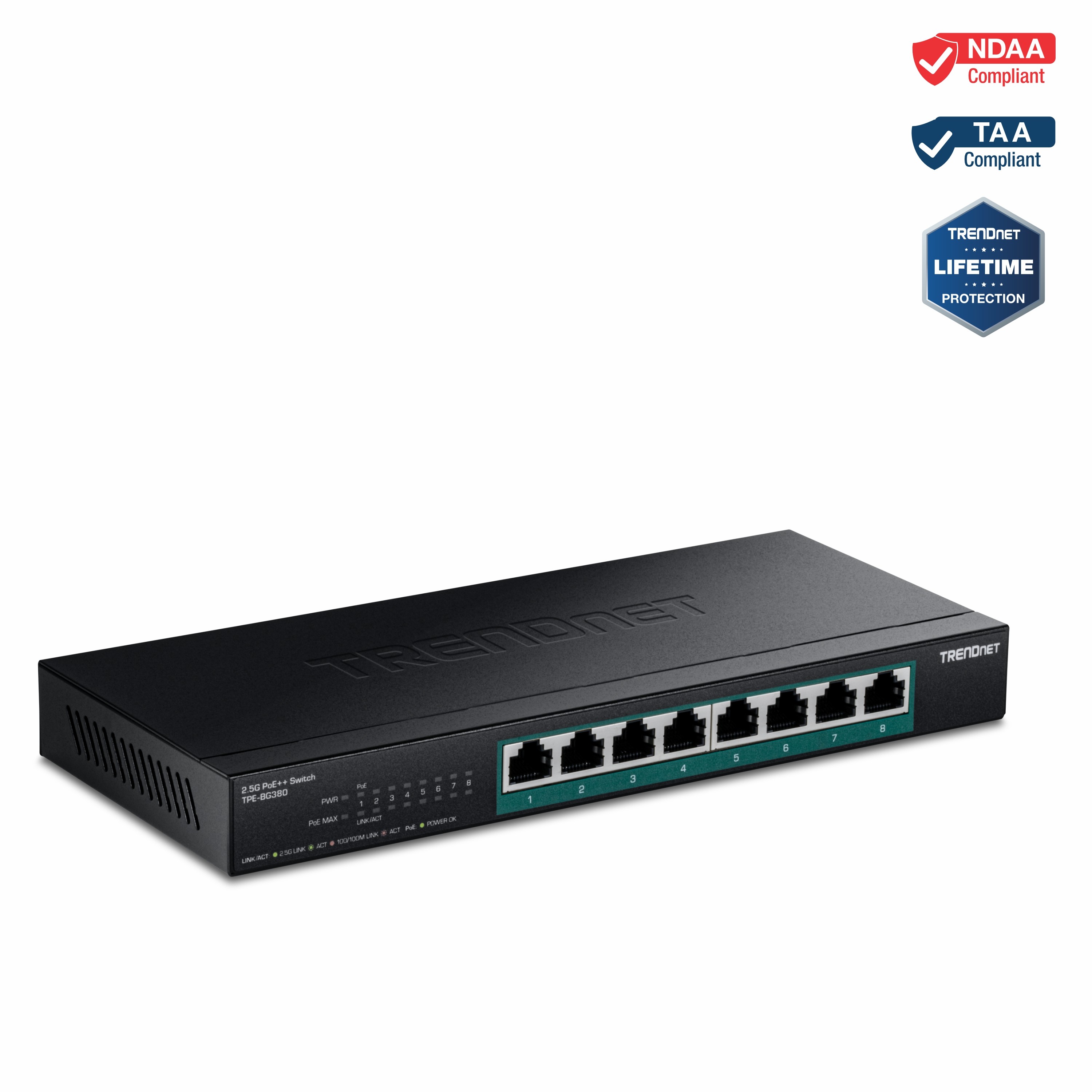 Expand your network’s bandwidth and reduce traffic bottlenecks with TRENDnet’s 8-Port 2.5G PoE++ Switch, model TPE-BG380. This 2.5G PoE++ switch is equipped with 2.5GBASE-T RJ-45 ports that provide multi-gigabit speeds capable of up to 2.5Gbps over your existing Cat5e or better cabling. This multi-gigabit PoE++ switch features a durable metal enclosure and can be mounted to the wall for setup flexibility. The fanless design lowers energy consumption and eliminates distracting operating noise. TRENDnet’s reliable 2.5G PoE++ switches are cost-effective solutions to increase your network’s throughput. A 230W total PoE power budget on this multi-gig PoE++ switch supplies up to eight PoE devices with up to 95W per port. Easily network PoE devices such as high-power wireless access points, cameras, digital signage, IPTV decoders, access controls, and more with this high-power 2.5 gigabit PoE++ switch.