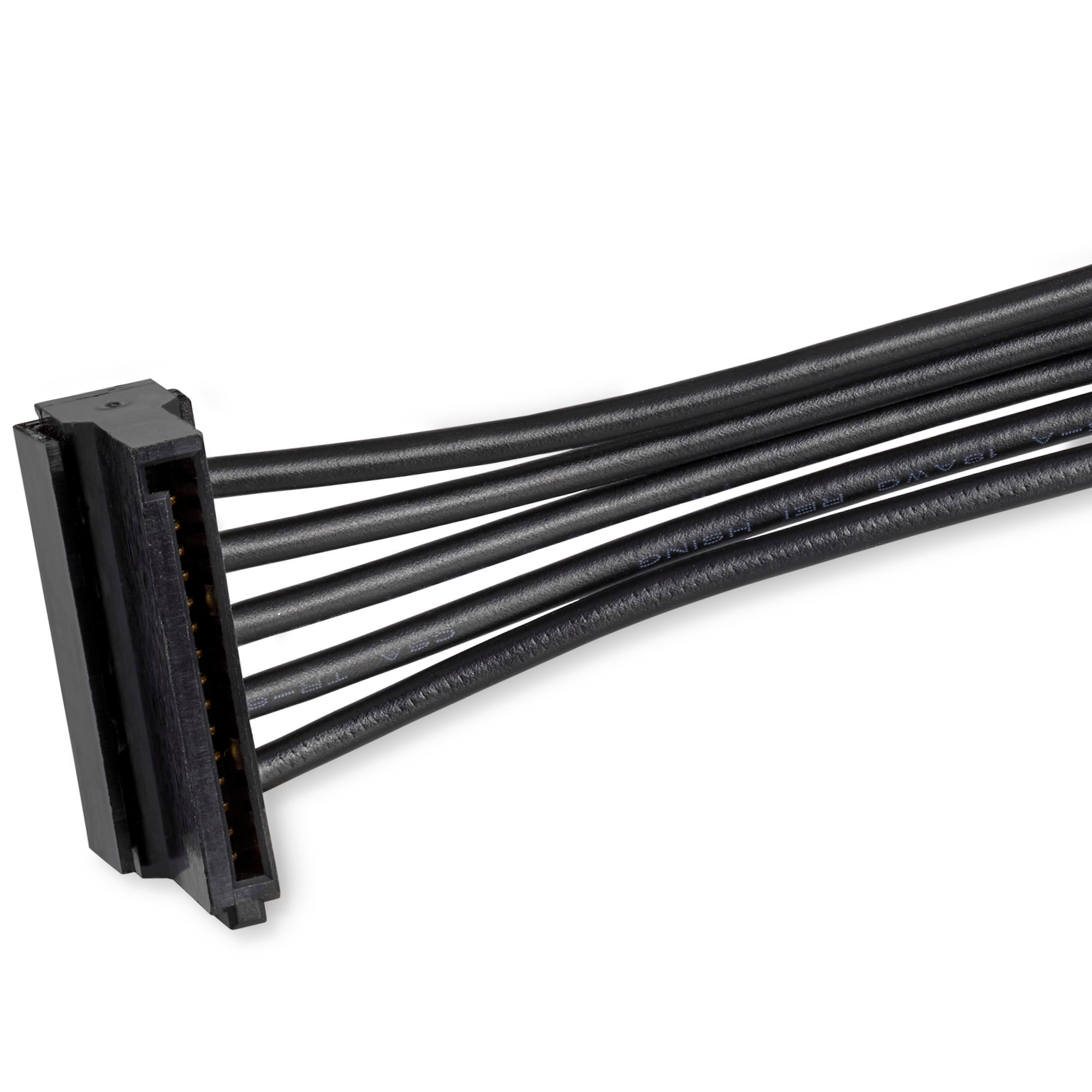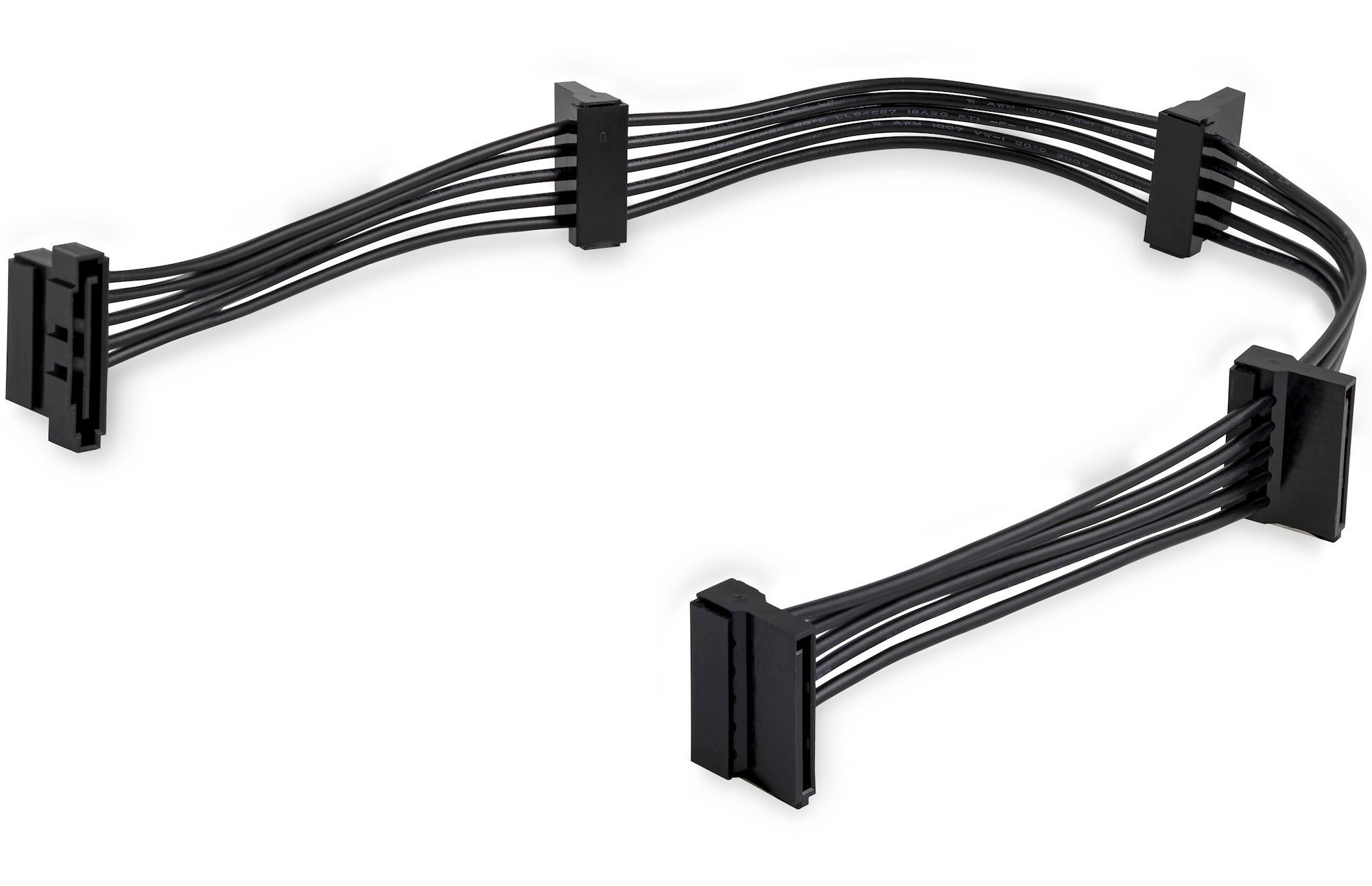 The PYO4SATA SATA power splitter cable (1-to-4) features a SATA male power connector that connects to a single computer power supply SATA connector, and breaks out into four SATA female power connectors.