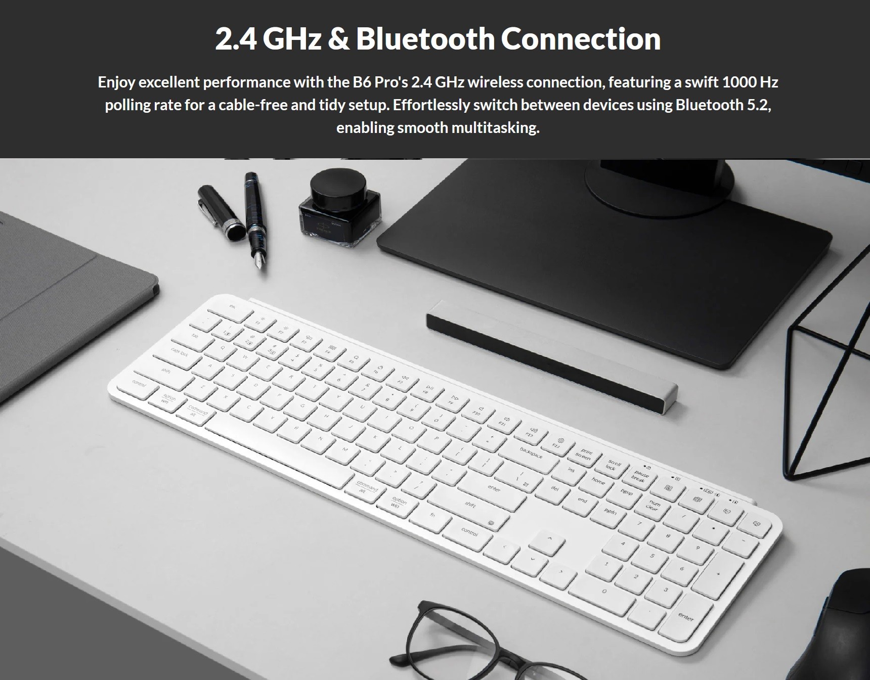 With a tilt angle of 3.2 degrees and an ultra-thin integrated body of 5.2mm thickness, it provides stability while typing, preventing wobbling and reducing fatigue even during long typing sessions.
