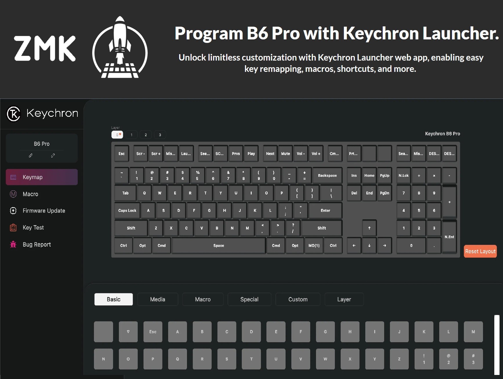 The Keychron B6 Pro is a lightweight, ultra-thin and full-size wireless keyboard with a 1,200-hour long battery life. It supports 2.4GHz wireless, Bluetooth, and wired modes, easily connecting to phones, tablets, PCs, and Macs. With ZMK customization, it offers tailored settings for home, office, or travel.