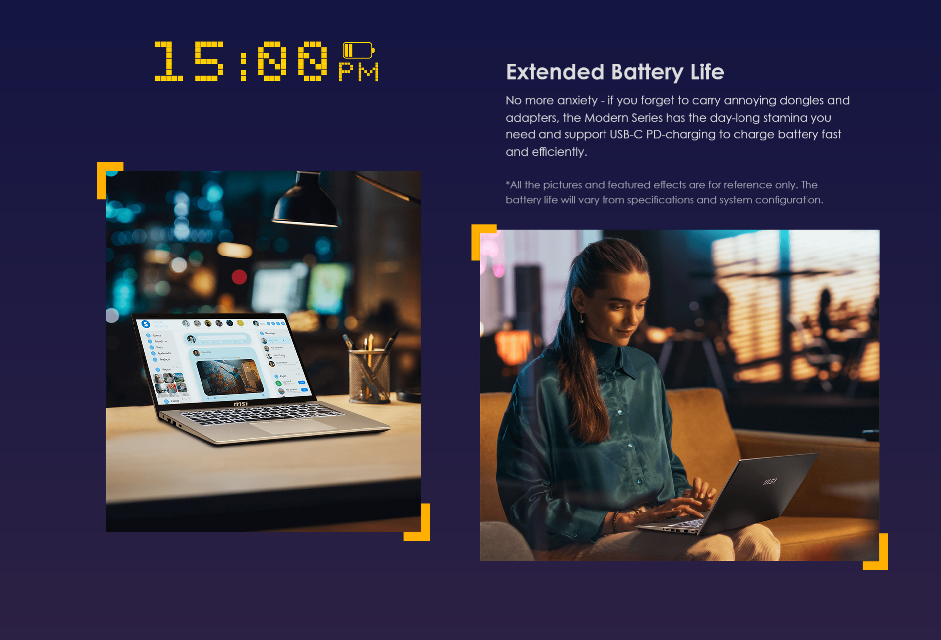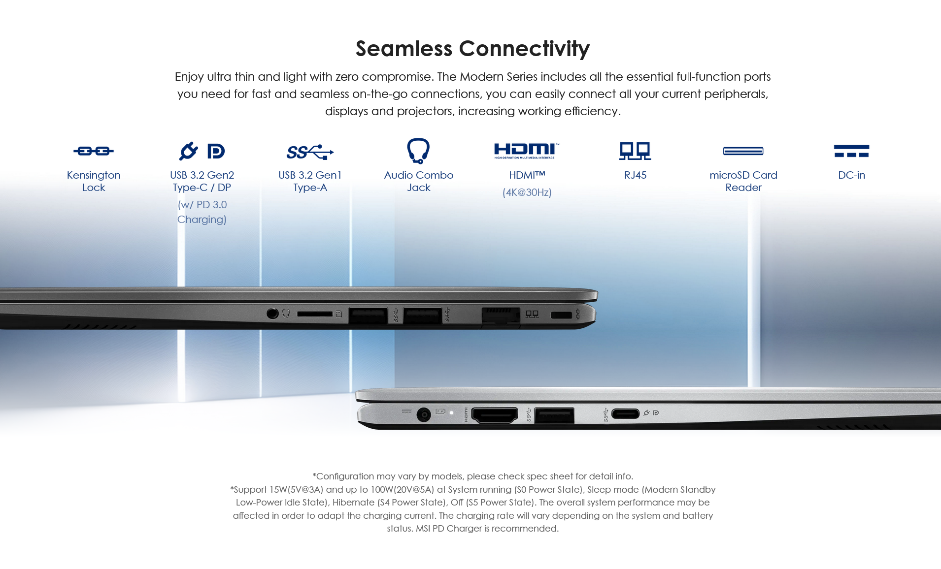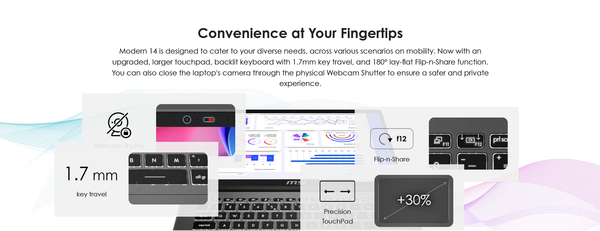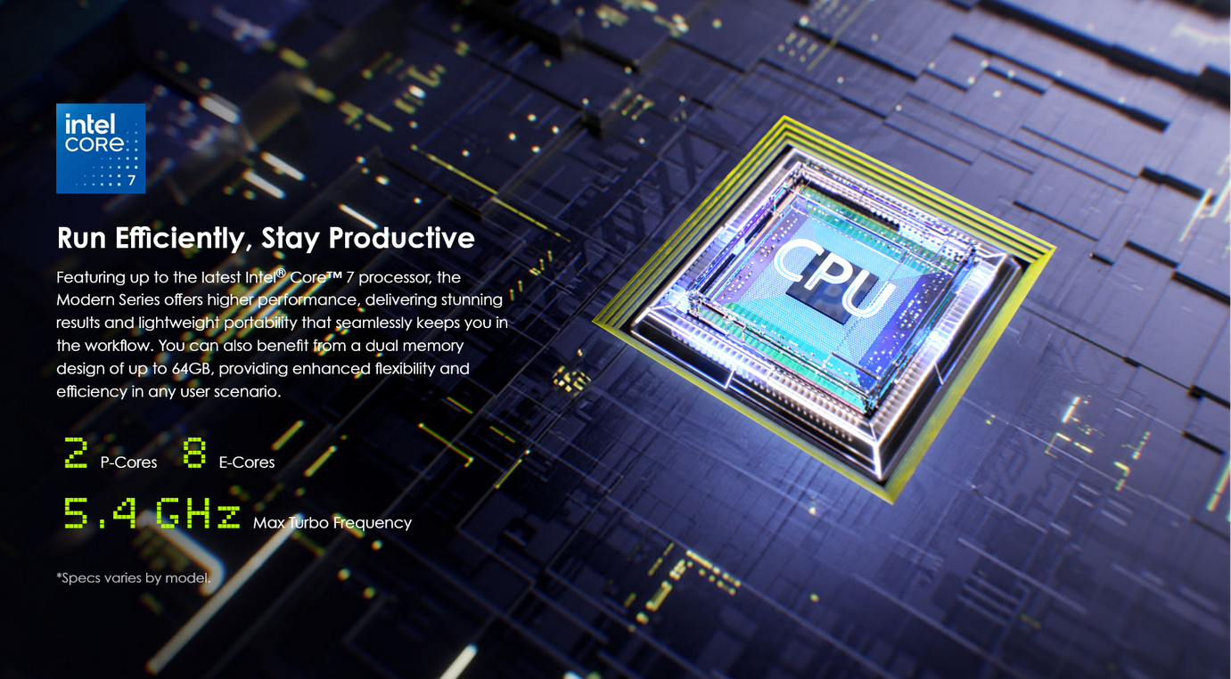 Elevate your business experience with the sleek and ultraportable Modern 14 F1M. Its ultra thin and light design is featured with up to an Intel ® Core™ 7 processor. With a long-lasting battery and a full complement of I/O ports, whether you are in the office, commuting or traveling, you will enjoy all-day power and productivity.