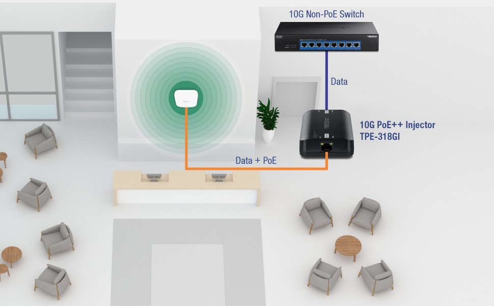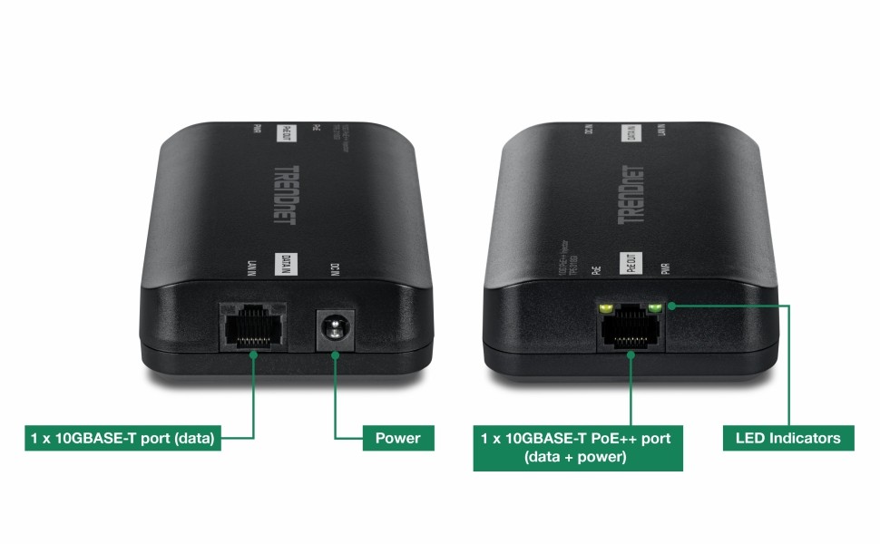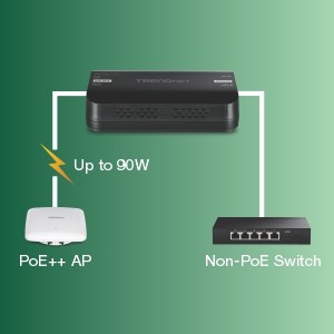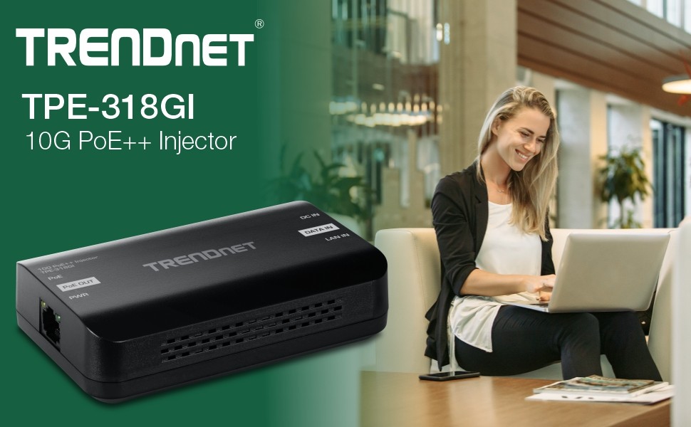TRENDnet’s 10G PoE++ Injector, model TPE-318GI, combines electrical power with a 10GBASE-Tnetwork connection to produce a 10G PoE++ network signal. Auto-sensing technology conveniently delivers the correct wattage needed to power your PoE, PoE+ and PoE++ devices. Connect the 10G PoE++ injector to a non-PoE switch, and then run an Ethernet cable with data + power to network a PoE, PoE+ or PoE++ device up to 100 meters (328 ft.) over Cat6A or better cabling. Network PoE devices such as wireless access points, IPcameras, VoIPphone systems, IPTV decoders, access controls, and more.