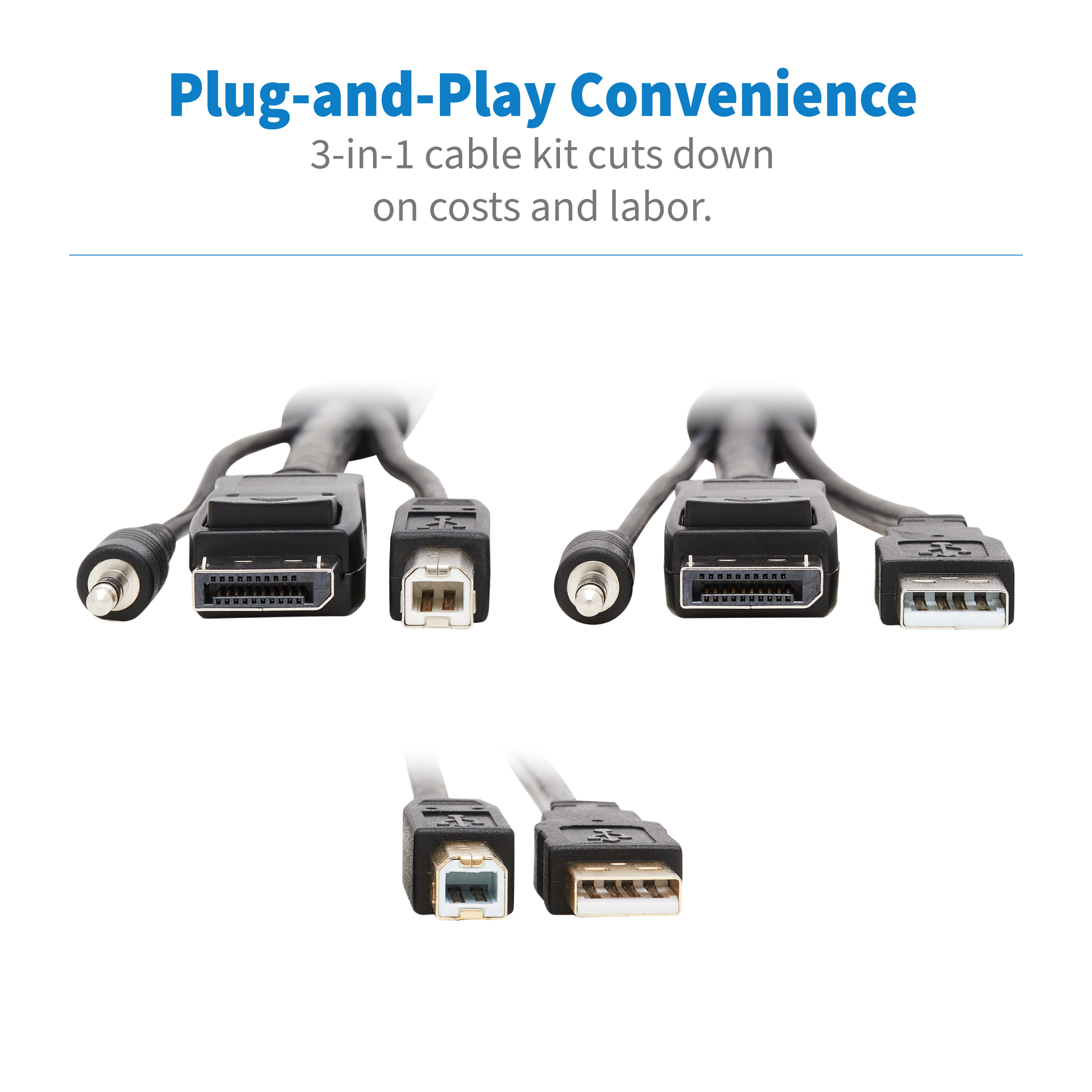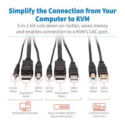 Featuring DisplayPort, USB and 3.5 mm audio connectors on both ends, Tripp Lite’s P783-006-U connects your DisplayPort computer to a KVM switch in one fell swoop, without requiring different cables. Recommended for Tripp Lite’s B002-HD1AC4 NIAP KVM switch, this 6 ft. cable cuts down on clutter and saves money by eliminating the need to purchase additional cables. An included USB A/B cable connects to the KVM’s Common Access Card (CAC) port, allowing you to access smart cards, scanners and biometric readers to bolster security.