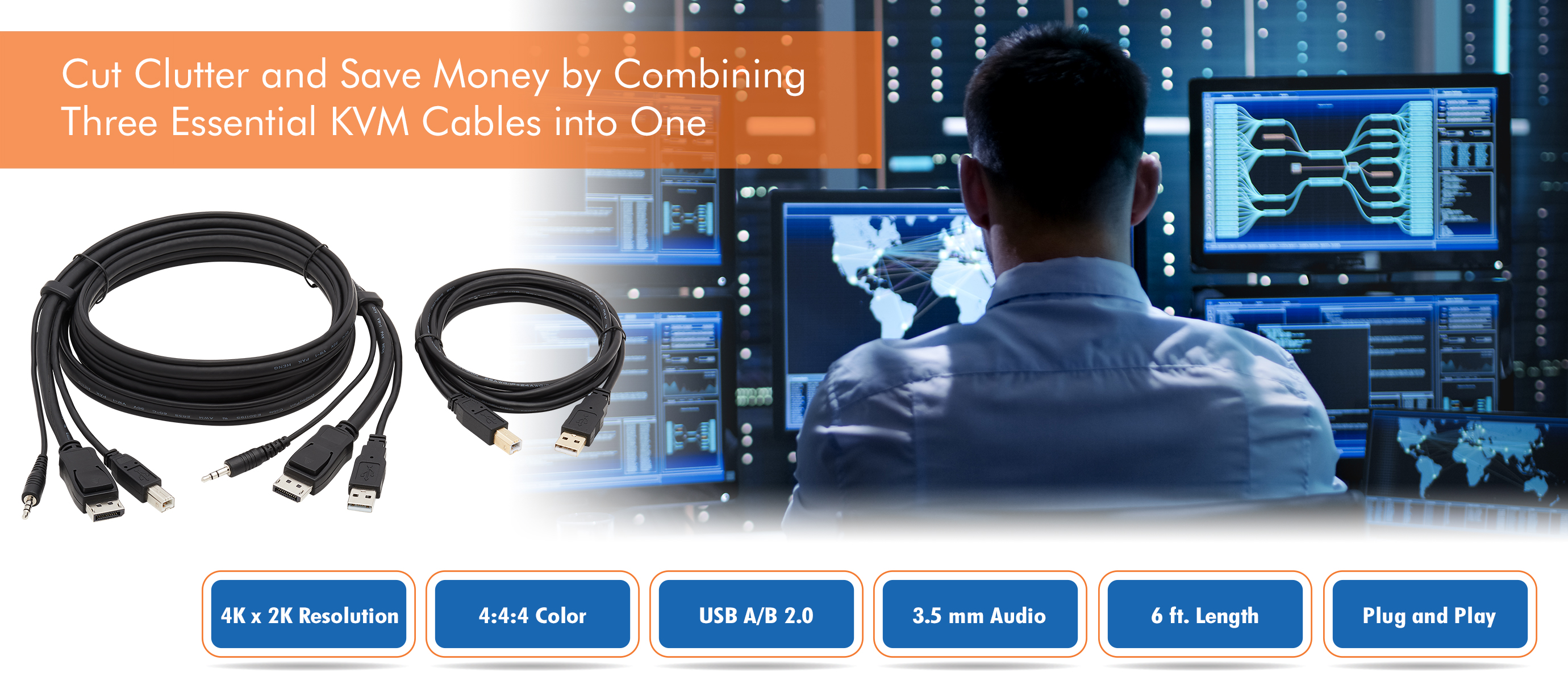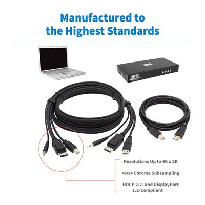 This top-of-the-line cable kit delivers UHD picture quality at resolutions up to 3840 x 2160 (4K x 2K) @ 60 Hz. It supports true 4:4:4 chroma subsampling, reducing data rate and file size, and meets HDCP 2.2, DisplayPort 1.2 and USB 2.0 standards (with speeds up to 480 Mbps).
