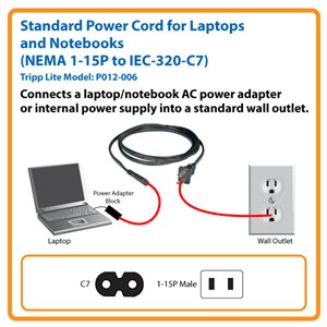 Tripp Lite’s P012-006 cable contains a non-polarized 2-prong NEMA 1-15P plug on one end and a non-polarized C7 connector on the other end. Simply connect the C7 end into a compatible AC power adapter block or internal power supply and insert the 1-15P plug into a standard AC wall outlet.