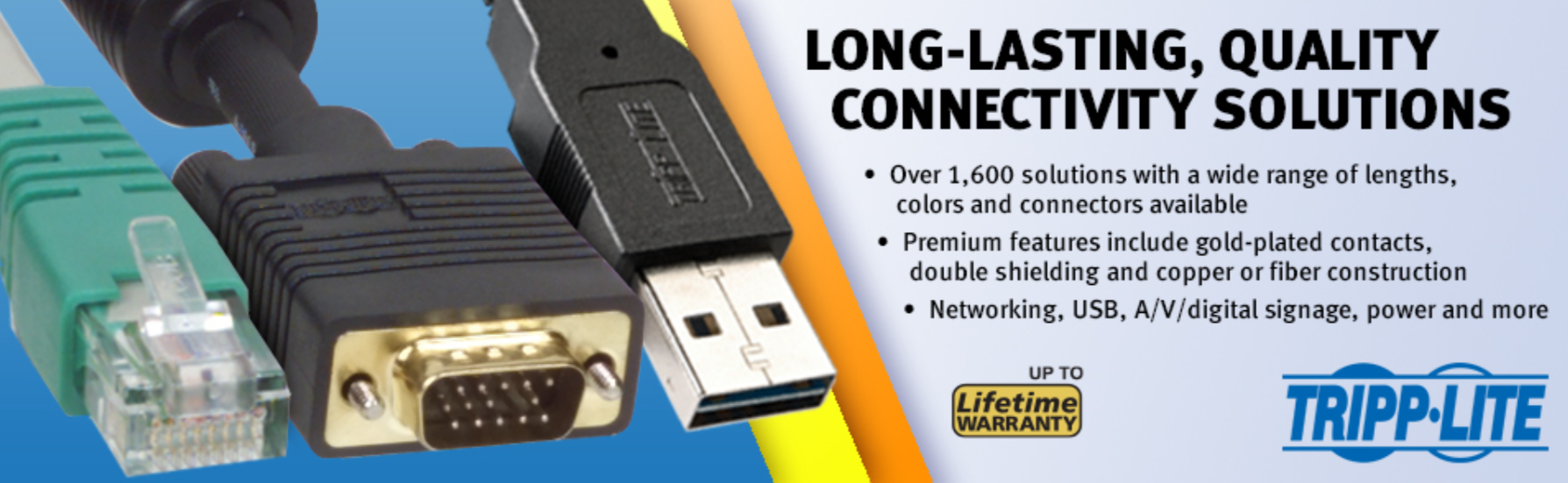 Founded in 1922 in Chicago, Illinois, Tripp Lite is a leading manufacturer of products to power, connect and protect your equipment. With a large selection of connectivity products, Tripp Lite has everything from USB hubs and reversible USB cables to fiber-optic cables and over Cat5e/Cat6 signal extenders. Whether you need to connect high-speed networks to switches, routers and servers in your data center, or send high-resolution video signals to displays and digital signs, Tripp Lite has the complete solution. Plus, before and after your purchase, our Chicago-based, in-house technical support specialists are available to assist you by phone, email and live chat. With over 90 years of quality products and service, Tripp Lite is a brand you can trust.