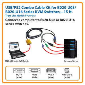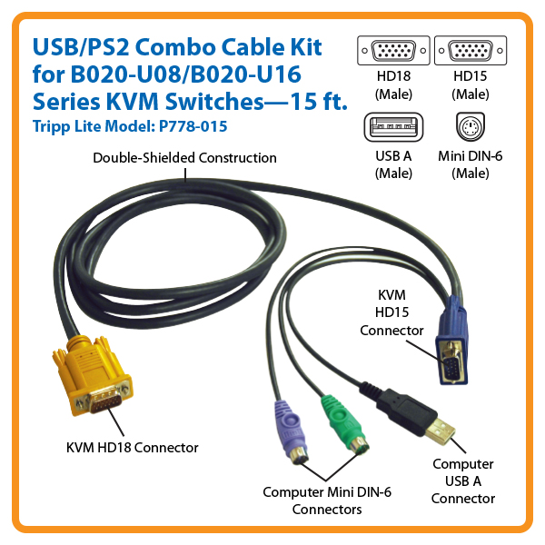 KVM Switch. Tripp Lite’s P778-015 USB-PS/2 Combo Cable consists of a 15-ft. cable with a modified HD18 (male) connector on one end to attach to your KVM switch and four connectors on the computer end: an HD15 (male) connector, a USB A (male) connector and two PS/2 (male) connectors for a mouse and keyboard. All connectors are color coded. For peace of mind, the P778-015 comes backed by a lifetime product warranty and has an eco-friendly, RoHS-compliant design.