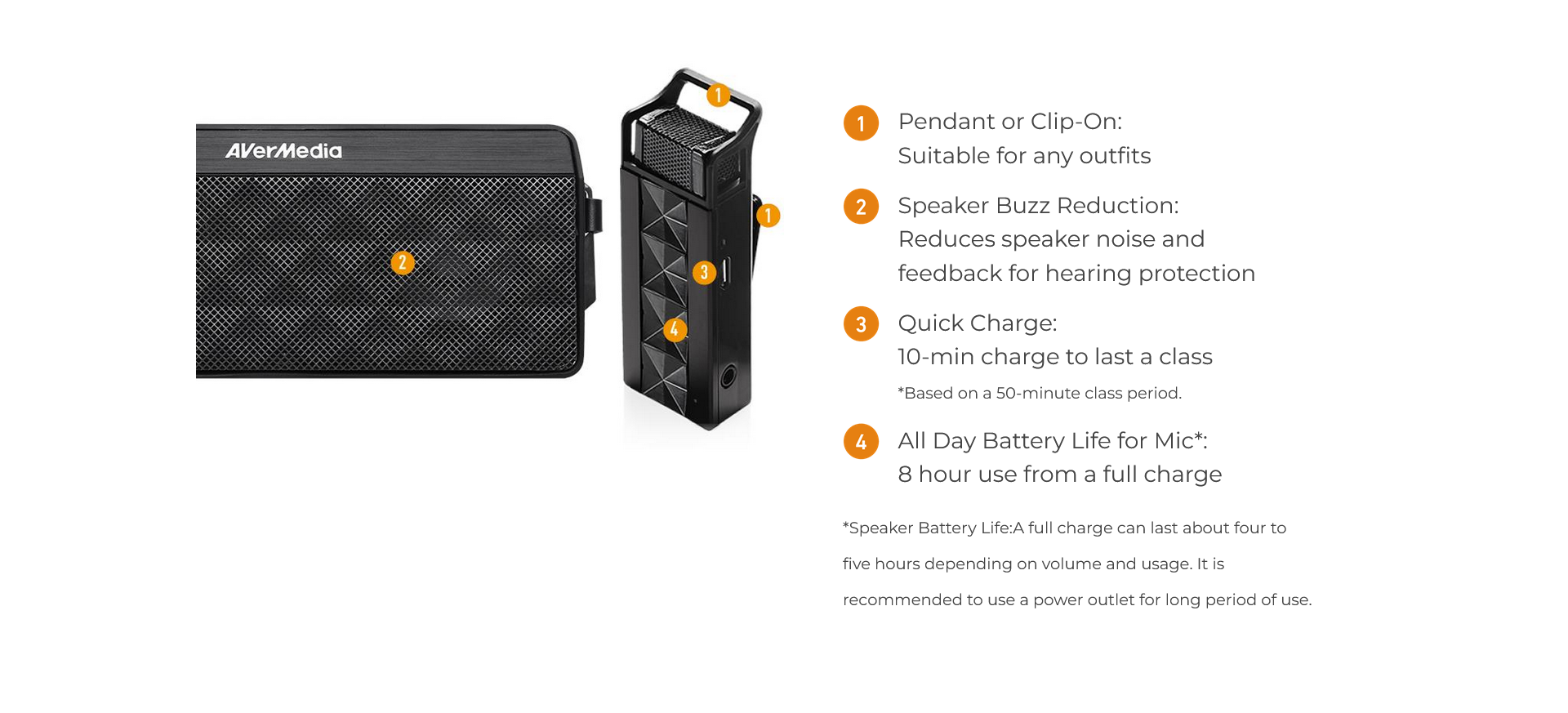 The microphone is able to maintain a constant 360° connection to the speaker virtually eliminating signal loss and channel interferences. Unlike IR microphones’ need for line-of-sight, or FM microphones’ channel limitations, our 2.4 GHz microphone always stays connected for clear, stable audio no matter where you’re facing.
