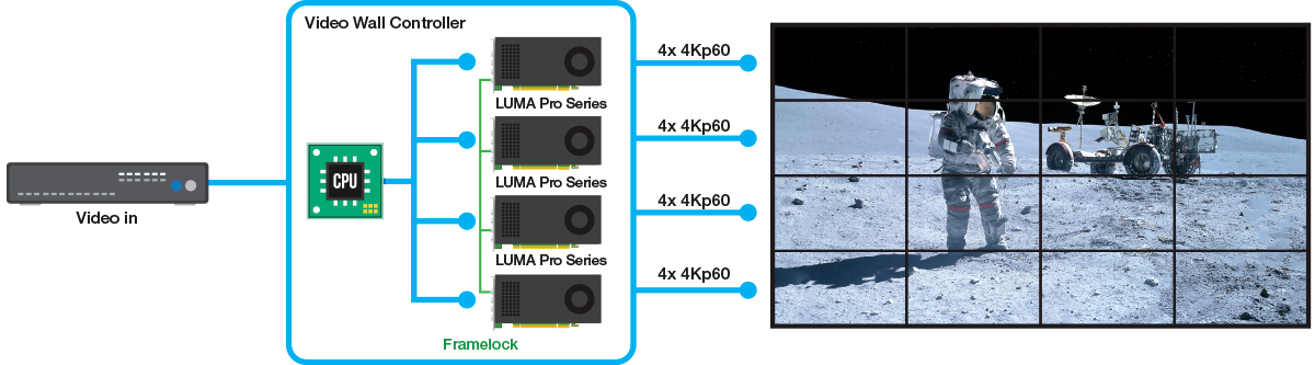 Drive up to sixteen synchronized displays and reduce tearing by framelocking up to four LUMA Pro cards together using board-to-board framelock cables. Also, save slot space—a separate card isn’t needed for the synchronization.