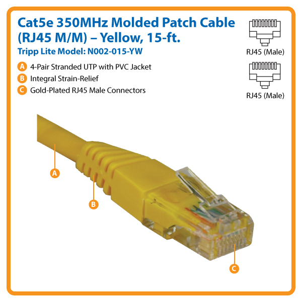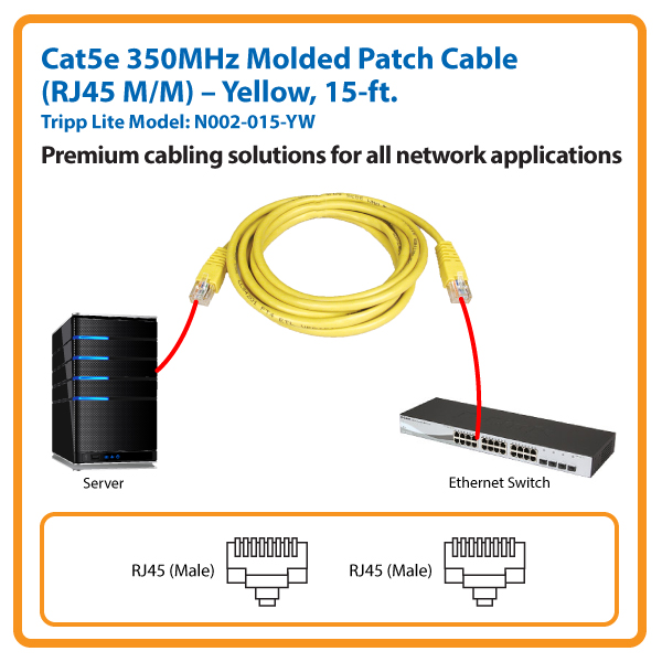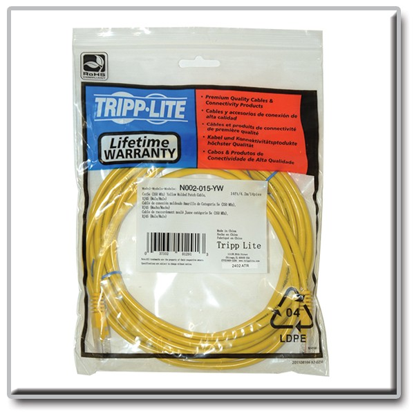 Don’t settle for less than the best—enjoy better signal quality and faster transmission! This 15-ft. Tripp Lite Cat5e 350MHz Molded Patch Cable ensures peak performance throughout your local area network application. Cat5e cables (also called network cables, patch cables, computer cables, Ethernet cables and LAN cables) are used to connect components like printers, computers, copy machines, routers, servers, modems and switches. The N002-015-YW is manufactured to exacting specifications, using superior materials, for optimal network performance. It’s designed for 1000Base-T (1 Gbps Ethernet), 10/100Base-T (Ethernet), 100 Mbps TPDDI, 155 Mbps ATM, ISDN, voice and Token Ring Type 3 applications. For peace of mind, the N002-015-YW comes backed by a lifetime warranty and has an eco-friendly, RoHS-compliant design.