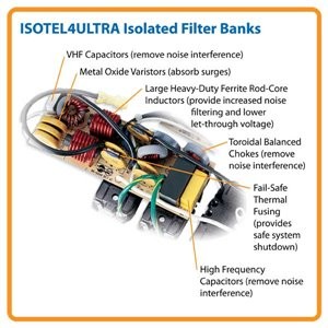 More joules mean more protection! The ISOTEL4ULTRA's 3330-joule surge suppression rating, Isobar surge protection technology and rugged all-metal housing shield connected equipment from even the strongest surges. EMI/RFI line noise filtering helps components perform at their peak. Line noise filtering eliminates performance problems that can be caused by radio transmissions, fluorescent lighting and appliances, while promoting longer component life spans.