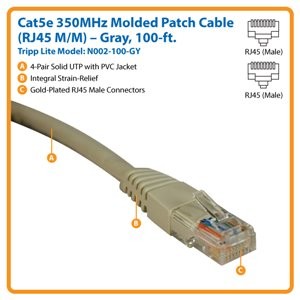 Manufactured from 4-pair solid UTP, the N002-100-GY provides high-speed connection and flawless signal delivery. This cable can deliver speeds up to 350MHz/1 Gbps. Featuring a PVC jacket, this 100-ft. Tripp Lite Cat5e 350MHz Molded Patch Cable is constructed of top-quality materials for long life and durability. Its RJ45 (male) connectors are gold-plated for accurate signal transfer and molded with integral strain-relief for a secure connection. The N002-100-GY meets the most current industry standards, including IEEE 802.3ab, IEEE 802.5, ANSI/EIA/TIA 568, ISO/IEC 11801 and ETL (category 5e draft 11).