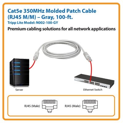 Don’t settle for less than the best—enjoy better signal quality and faster transmission! This 100-ft. Tripp Lite Cat5e 350MHz Molded Patch Cable ensures peak performance throughout your local area network application. Cat5e cables (also called network cables, patch cables, computer cables, Ethernet cables and LAN cables) are used to connect components like printers, computers, copy machines, routers, servers, modems and switches. The N002-100-GY is manufactured to exacting specifications, using superior materials, for optimal network performance. It’s designed for 1000Base-T (1 Gbps Ethernet), 10/100Base-T (Ethernet), 100 Mbps TPDDI, 155 Mbps ATM, ISDN, voice and Token Ring Type 3 applications. For peace of mind, the N002-100-GY comes backed by a lifetime warranty and has an eco-friendly, RoHS-compliant design.