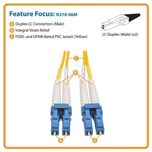 The N370-06M has 8.3/125 duplex (zipcord) fiber made from glass, instead of polymer. The sturdy LC male connectors meet stringent insertion loss standards and feature beveled edges on their glass ends for easy insertion into a patch panel or switch. The FDDI- and OFNR-rated PVC jacket is yellow to easily identify it as a singlemode cable.
