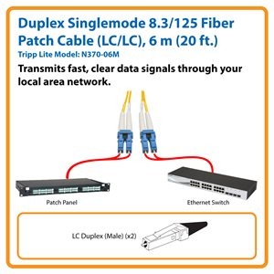The N370-06M Duplex Singlemode 8.3/125 Fiber Patch Cable (LC/LC) transmits fast, clear data signals through your LAN with a higher bandwidth than multimode cable for up to twice the throughput. Designed for network equipment that requires singlemode fiber optic patch cables, this 6-meter (20-foot) cable has attenuation loss that meets or exceeds current standards.