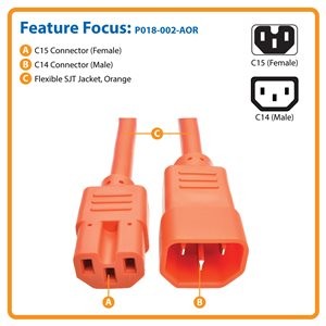 The P018-002-AOR features an orange SJT jacket and fully molded orange ends, allowing you to easily identify your connections in a crowded rack or workstation.