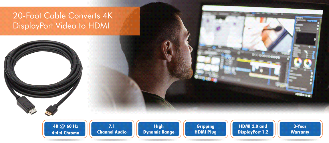 Having a cable come loose accidentally can mean costly and time-consuming signal loss. The latching DisplayPort and gripping HDMI connectors help you avoid such danger, protecting your audio/video transmission by maintaining a secure link without failure.