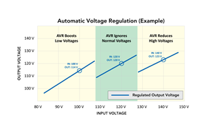 In locations with chronic voltage problems, frequent switching to battery drains reserve power and shortens battery life. This UPS system has a feature called automatic voltage regulation (AVR) that solves the problem. The UPS detects when input voltage is out of bounds and corrects it without using the battery.