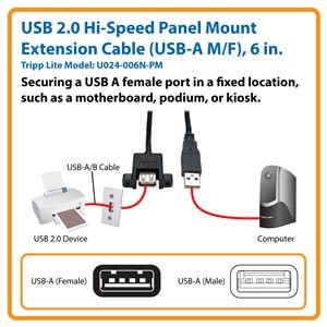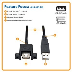 Tripp Lite’s U024-06N-PM extends the connection between your USB Type-A devices by six inches. It’s the ideal extension cable for a USB A female port in a fixed location, such as a motherboard, podium or kiosk. Backward compatible with earlier USB generations, the U024-06N-PM supports data transfer rates up to 480 Mbps, making it ideal for multimedia applications.