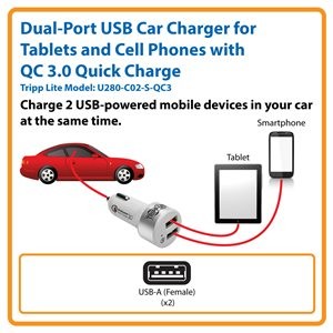 The U280-C02-S-QC3 Dual-Port USB Car Charger with Qualcomm® Quick Charge™ 3.0 Technology lets you quickly and safely charge two USB-powered mobile devices in your vehicle at the same time. You and your passenger can connect your cell phones simultaneously to ensure full charges when you reach your destination. This charger is also recommended for tablets, MP3 players and other USB devices.