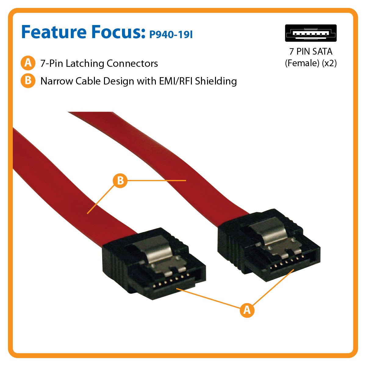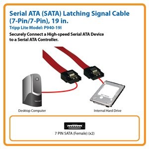 Tripp Lite’s P940-19I Serial ATA (SATA) Latching Signal Cable connects any high-speed Serial ATA device to a Serial ATA controller. Perfect for the desktops or servers equipped with multiple drives, this 19 in. cable features two 7-pin female latching connectors for secure connections to equipment.