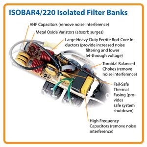 The Isobar is the only surge protector line with internal barriers (called isolated filter banks) that prevent disruptive line noise from causing A/V distortion, computer lock-ups, data errors and similar problems. Isobar's unique protection system combines large toroidal chokes, ferrite rod-core inductors, HF/VHF capacitors and multiple layers of metal oxide varistors into two exclusive isolated filter banks that remove EMI/RFI interference and prevent system crashes, reboots and performance problems.