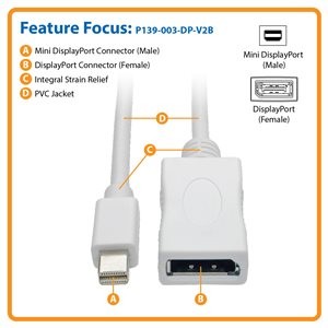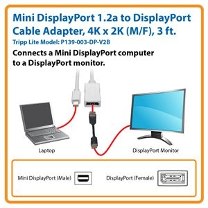 The Tripp Lite P139-003-DP-V2B Mini DisplayPort 1.2a to DisplayPort Cable Adapter and Video Converter (M/F) allows you to use your existing DisplayPort™ monitor with a new Mini DisplayPort (mDP) computer without the expense of buying a new monitor. This unit connects the cable of your DisplayPort-enabled monitor or projector to the mDP or Thunderbolt™ port on your computer or laptop, making it ideal for converting a 4K x 2K video signal for presentation on a DisplayPort display.