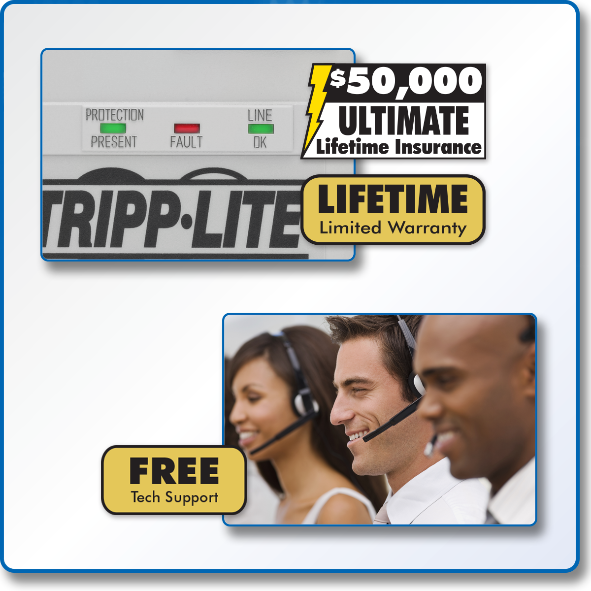 If your connected equipment is damaged by a surge—even a direct lightning strike—Tripp Lite will repair or replace it up to the value of the Ultimate Lifetime Insurance. If the surge protector stops working, simply return it to Tripp Lite for a free replacement. And if you ever have a question, our Chicago-based tech support team is standing by ready to assist you free of charge.