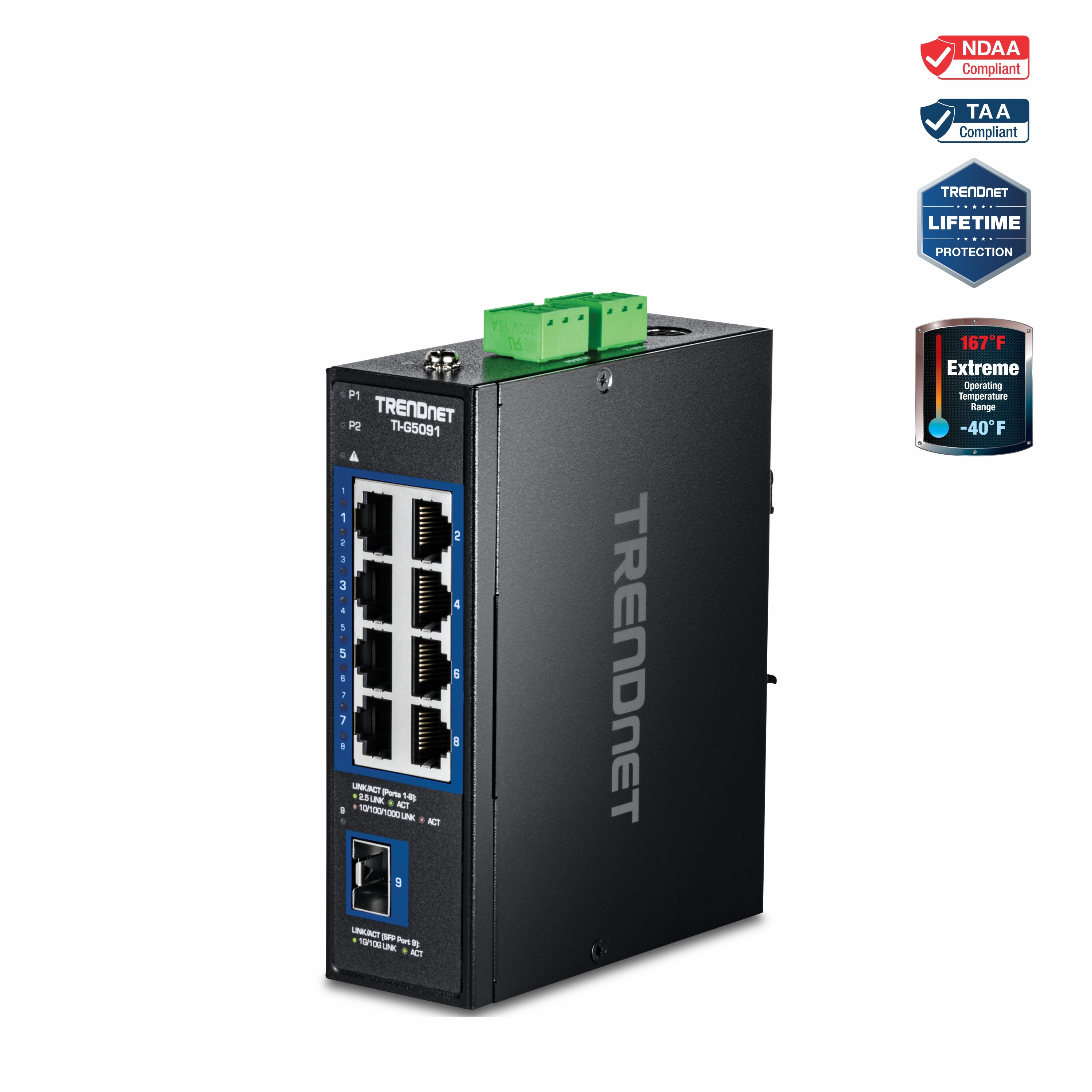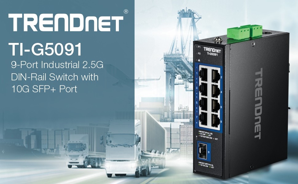 TRENDnet’s 9-Port Industrial 2.5G DIN-Rail Switch with 10G SFP+ Port, model TI-G5091, features a rugged IP50 rated metal enclosure and is designed to work in the harshest networking environments. This industrial 2.5G switch is designed to withstand a high degree of vibration and shock, while operating in both high and low temperatures for industrial environments within -40° – 75° C (-40° – 167° F). Redundant power inputs with overload current protection, and a power failure alarm relay minimize network downtime. This industrial multi-gig switch features 2.5G RJ-45 ports for high-speed device connections, and a 10G SFP+ port for backbone fiber networking applications.