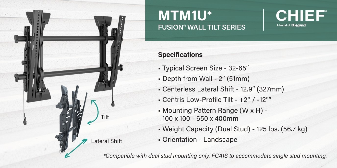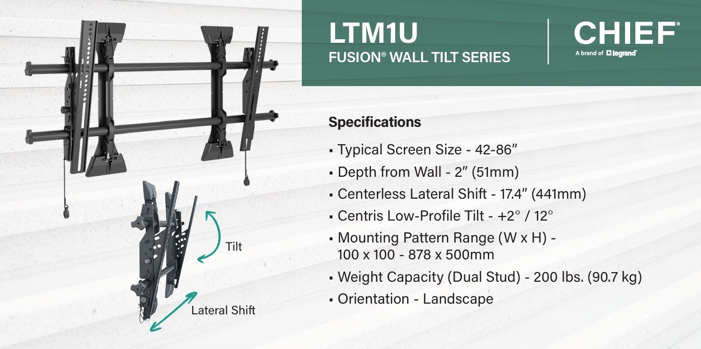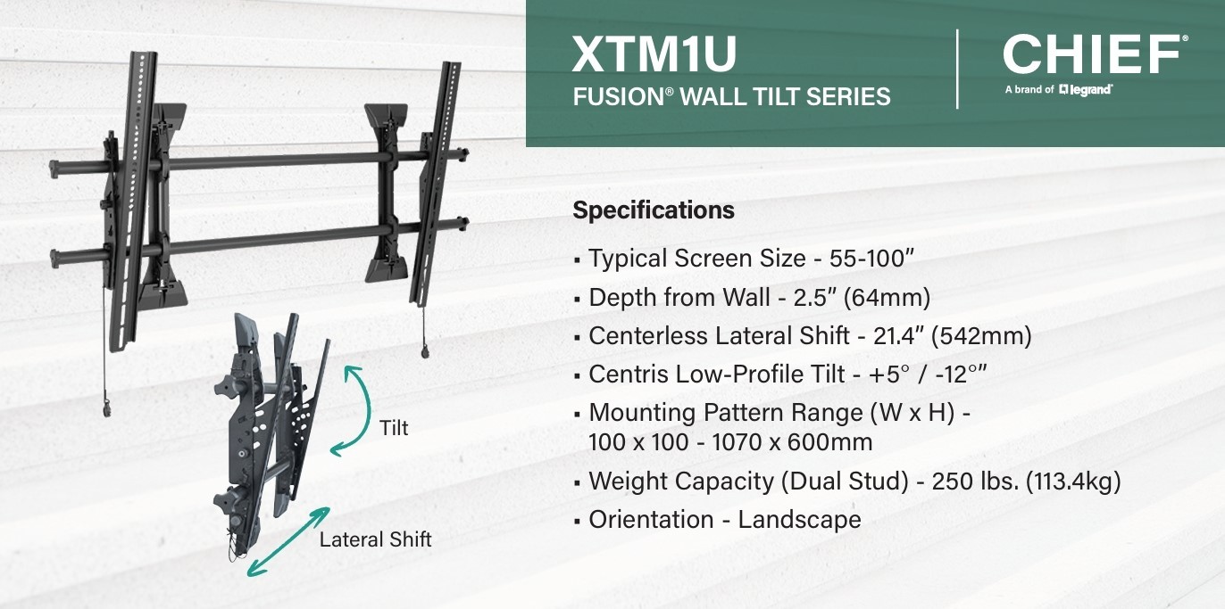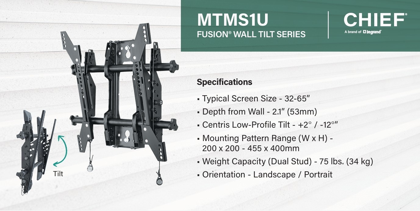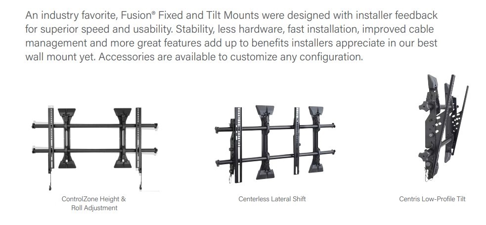 Chief's Fusion® tilt wall mounts were developed based on installer feedback and direct observations of installers in the field. Favorite Fusion® features include Centerless shift, Centris tilt, ControlZone leveling adjustment and ClickConnect Latching.