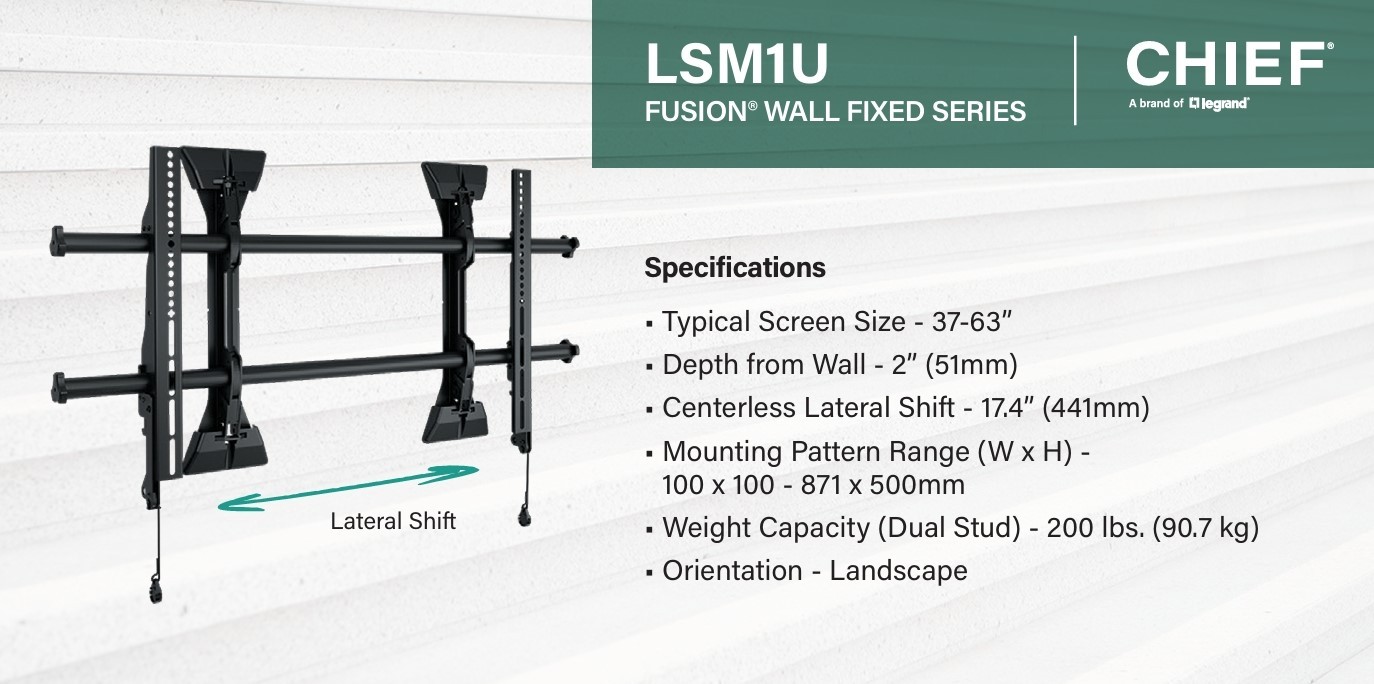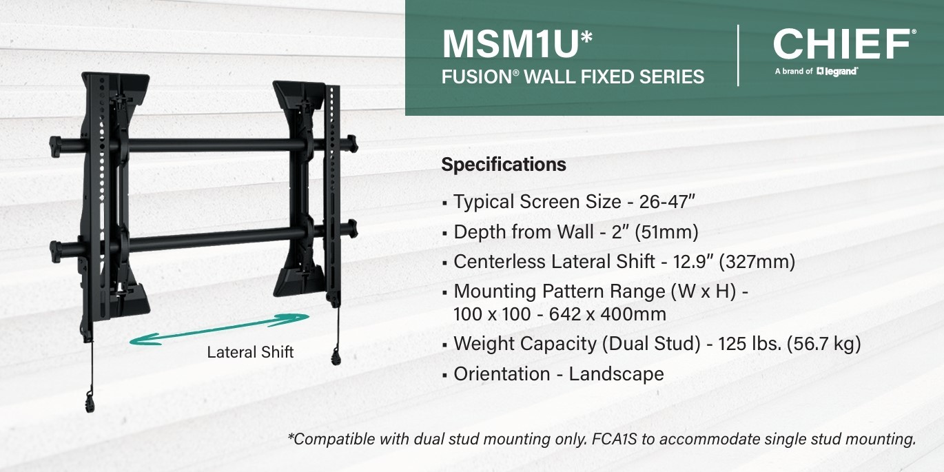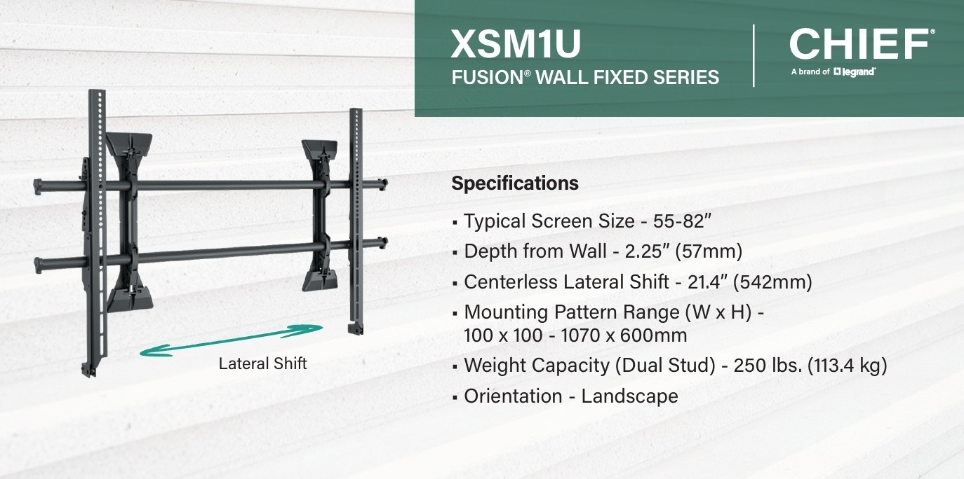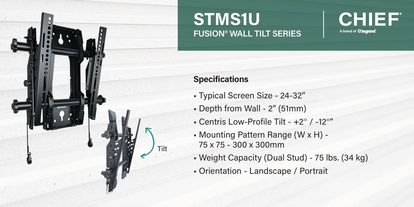 Chief's Fusion® tilt wall mounts were developed based on installer feedback and direct observations of installers in the field. Favorite Fusion® features include Centerless shift, Centris tilt, ControlZone leveling adjustment and ClickConnect Latching.