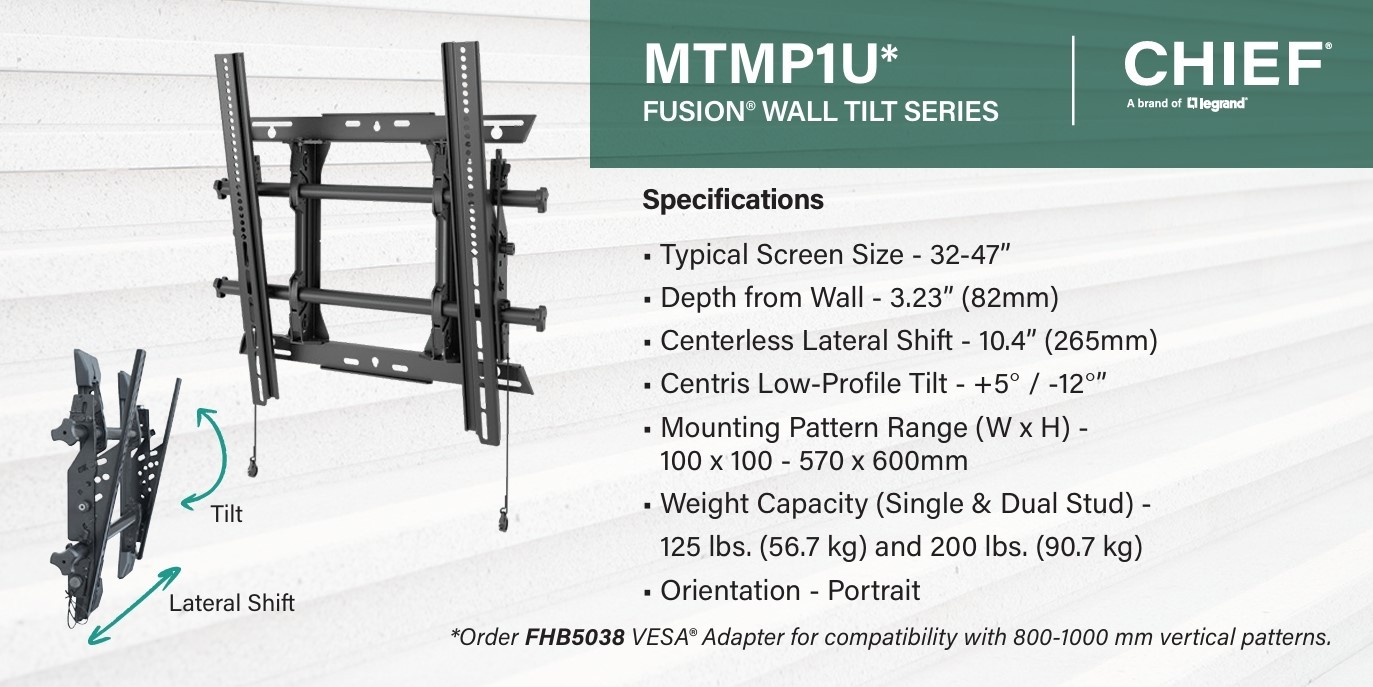 The installer-inspired Fusion tilt mount solves top flat panel installation problems, offering flexible adjustments for large displays with a low-profile display mounting solution.
