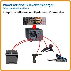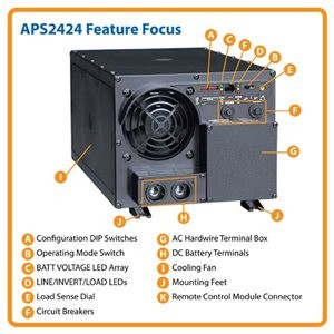 The APS2424 efficiently converts DC power from a vehicle battery into 120V AC power for any type of equipment, from heavy-duty drills, saws and pumps to computers and sensitive monitoring equipment. The APS2424 provides safe, stable, AC output power to help connected equipment perform at its peak. A frequency control feature ensures that devices dependent on tightly regulated AC line frequency, such as computers, VCRs and DVD/CD players, receive clean computer-grade power.