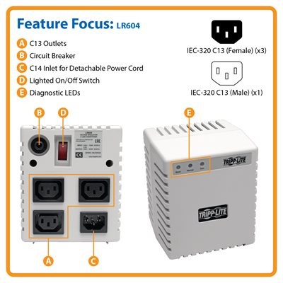 Plug your PC, laser printer, scanner, router, modem, television, stereo receiver or other home/office electronics into three C13 AC outlets to protect them against dangerous surges, spikes and line noise. The LR604 maintains nominal 230V power, which helps prevent lights from dimming or appliances from shutting down during use due to changes in voltage.
