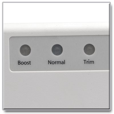 When the LR604 is plugged into an outlet and turned on, its LED indicators keep you constantly apprised of your incoming power’s condition. Green indicates your AC line voltage is normal. The yellow Boost light means the LR604 is boosting low voltage to nominal 240V levels, and the yellow Trim light means high voltage is being trimmed down to nominal 240V levels. You will also hear a clicking sound when the unit is correcting high or low voltage.