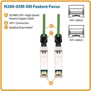 The N280-05M-GN is manufactured using top quality materials. With 100 ohm Twinaxial copper cable and die-cast metal small form factor connectors, Tripp Lite’s SPF+ DAC cables are made to last in high-demand data center and networking applications. Additionally, it comes backed by a lifetime warranty and features an environmentally responsible RoHS-compliant design.