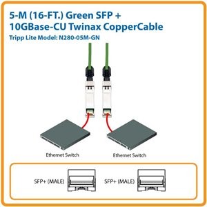 This genuine Tripp Lite 10 Gbps SFP+ Direct Attach Copper cable is the ideal solution for 10 Gbps and fiber channel networks in need of fast, clear signal transmission up to the latest in industry standards. Tripp Lite SFP+ cables were developed as cost effective, low power alternatives to fiber optic cables, in high speed interconnect applications such as network storage and enterprise networking. The N280-05M-GN conforms to SFF-8431 standards, and as such can be used with the following manufacturer’s equipment that are open to 3rd party cables: Qlogic, Emulex, Juniper, Arista, IBM, Dell, Extreme, EMC, Broadcom, Finisar, Voltaire and Cisco.