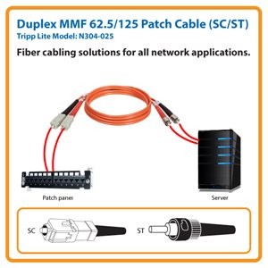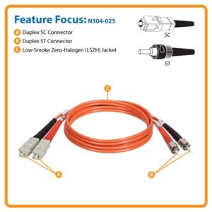 The N304-025 has dual SC/ST connectors that are widely compatible and thoroughly tested to meet stringent insertion loss standards. The connectors are color coded and have beveled edges for a secure connection.