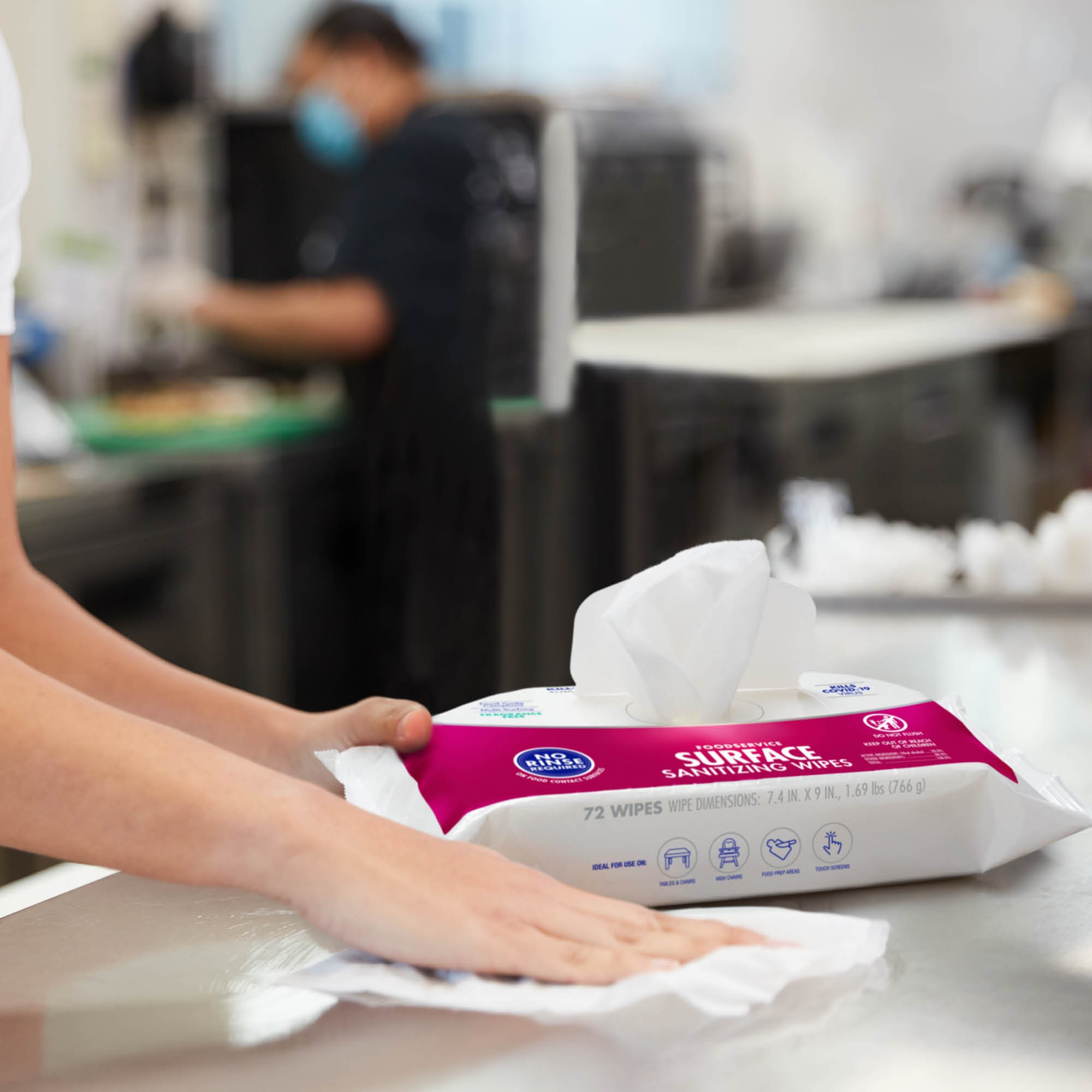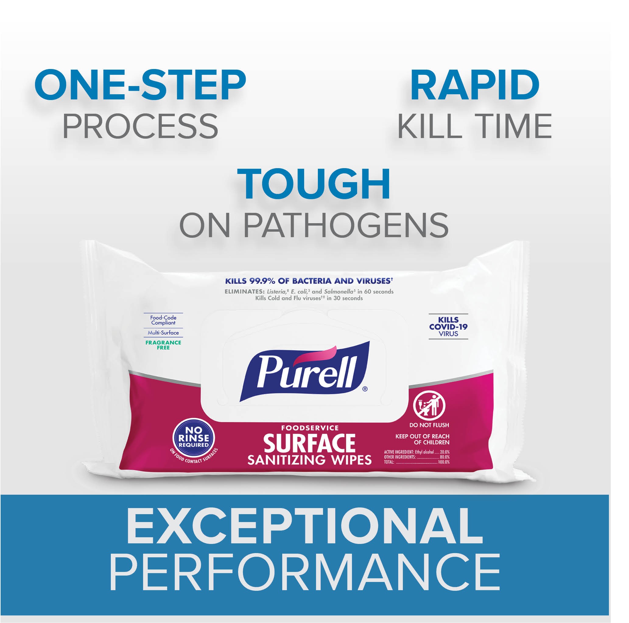 PURELL Surface Wipes offer a unique combination of fast kill times, powerful efficacy, and trustworthy disinfection. These innovative wipes come from the same company that brings you America’s no. 1 brand of hand sanitizer (1). They offer convenient sanitizing, disinfection, and cleaning ability with uncompromising efficacy without harsh chemicals or precautionary statements. Use throughout your foodservice establishment on the hard surfaces people touch the most — including food-contact surfaces with no rinse required.