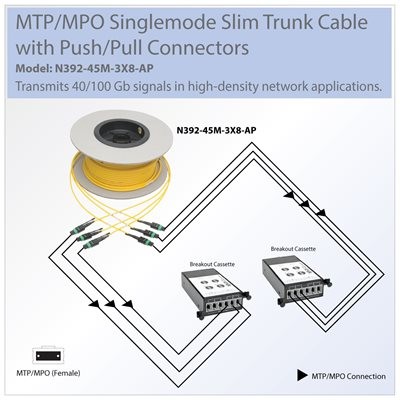 Designed for high-density fiber patching between data center main distribution frames (MDFs) and intermediate distribution frames (IDFs), Tripp Lite’s N392-45M-3X8-AP MTP/MPO Singlemode Slim Trunk Cable ensures peak performance throughout your local area network. With three female MTP/MPO connectors on each end, this 8.3/125-rated 45-meter cable supports 40/100 Gb Ethernet speeds and is optimized for QSFP+ 40GBASE-PLR4 and QSFP28 100GBASE-PSM4 networks. It also features a 6 mm dual plenum-rated jacket and bend-insensitive fiber, so it’s perfect for connecting high-speed network components through ceilings, walls and ducts.